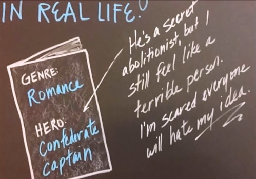 That hit me hard. I kept thinking, “What a sad and horrible state to be in. To fear having a character be judged instantly, without the book even being read, just for a historical affiliation? The owner of this secret is afraid to write their story, to give life to a character, because of a political atmosphere.” (For context, this was during the controversy over the removal of Confederate statues from public places in the south.)